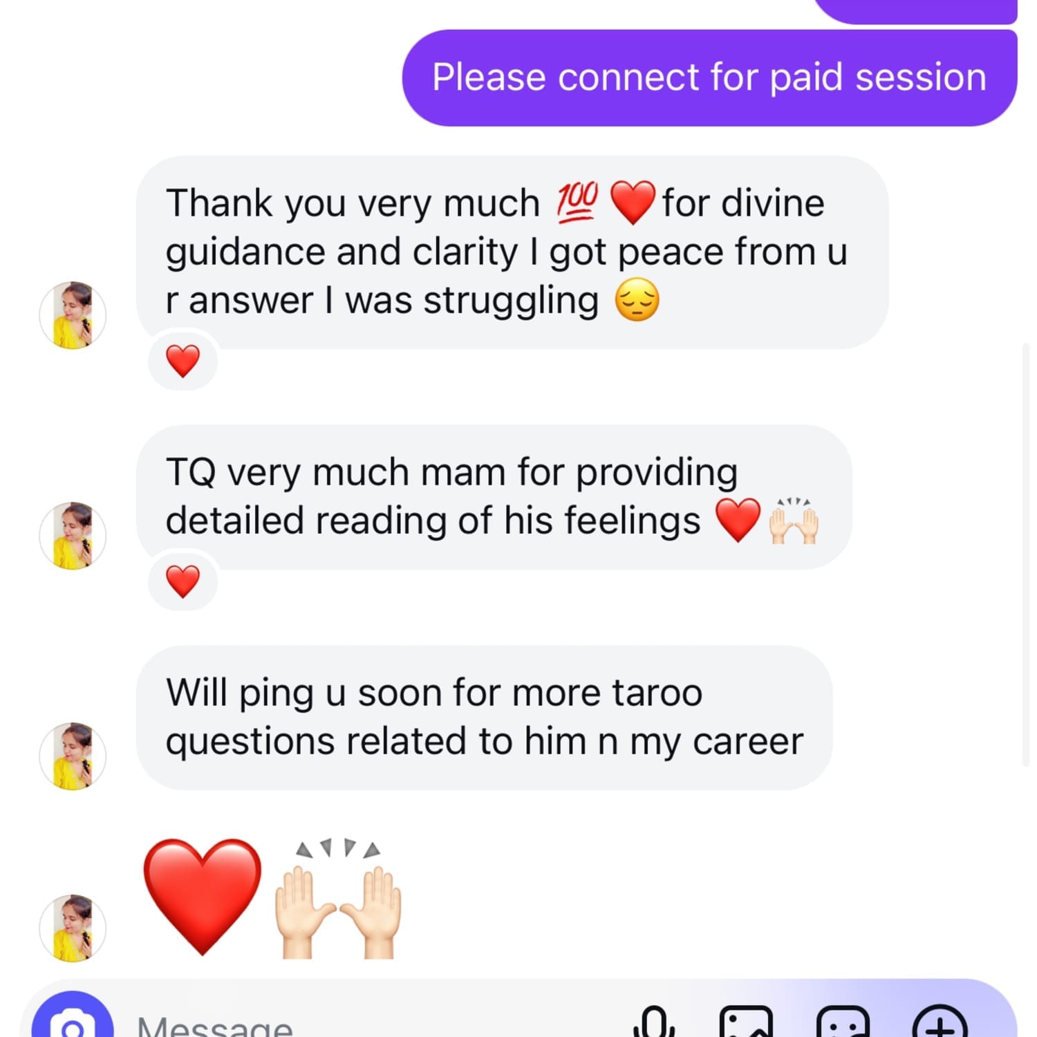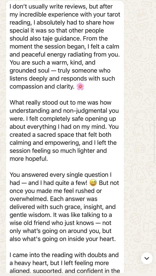 If you’ve read this far, I know you’re genuinely looking for answers. So go ahead, book a session now. We’ll talk in depth during the reading.