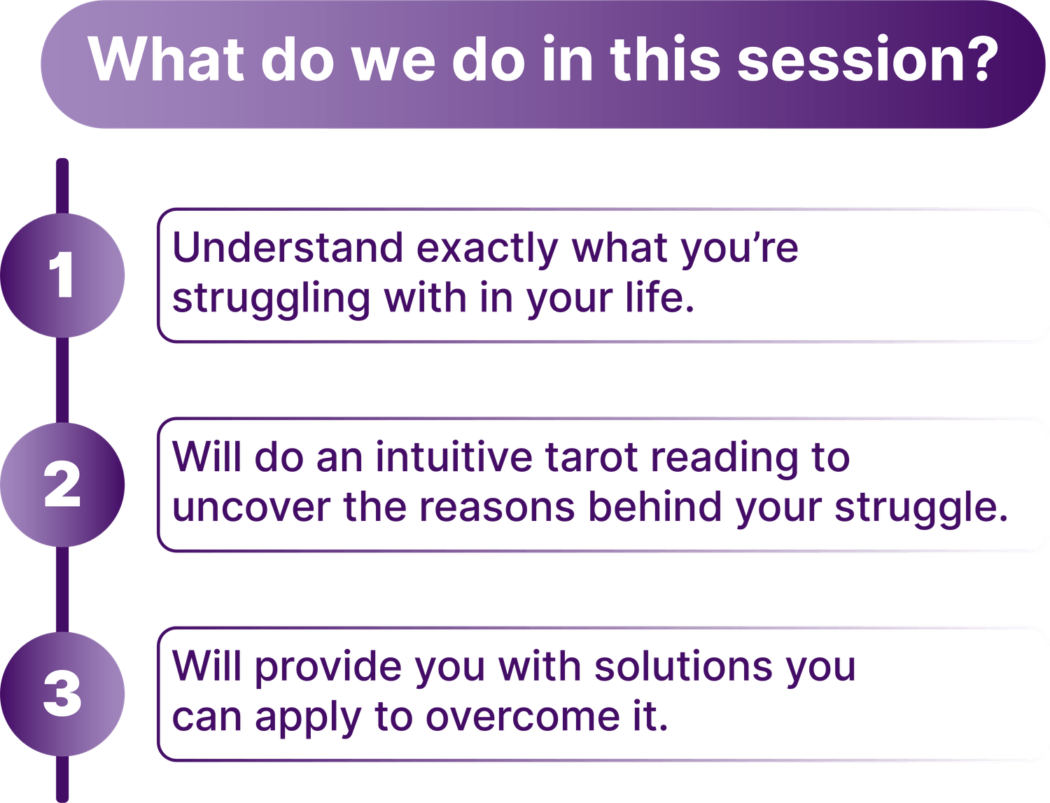 I’ll first listen to what you’re struggling with, then do an intuitive tarot reading to understand the deeper reasons behind your challenges, and finally share actionable guidance you can apply.