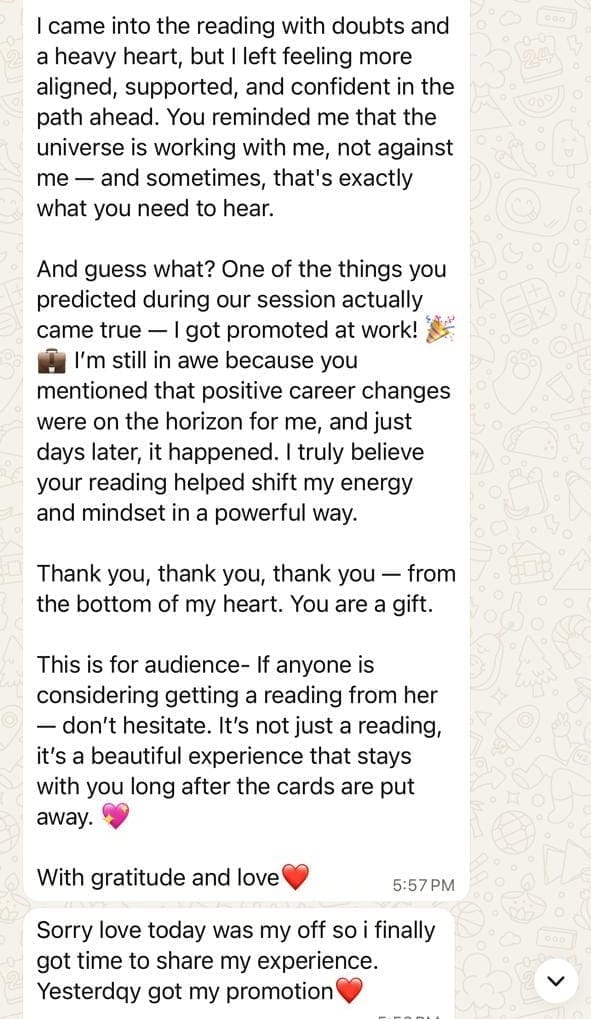 In my search for answers, I happened to book a tarot reading session. That one session brought me such unexpected clarity, it was like all the chaos in my mind suddenly made sense.